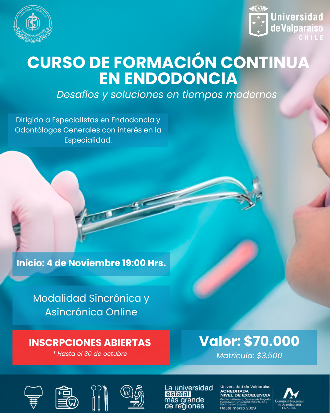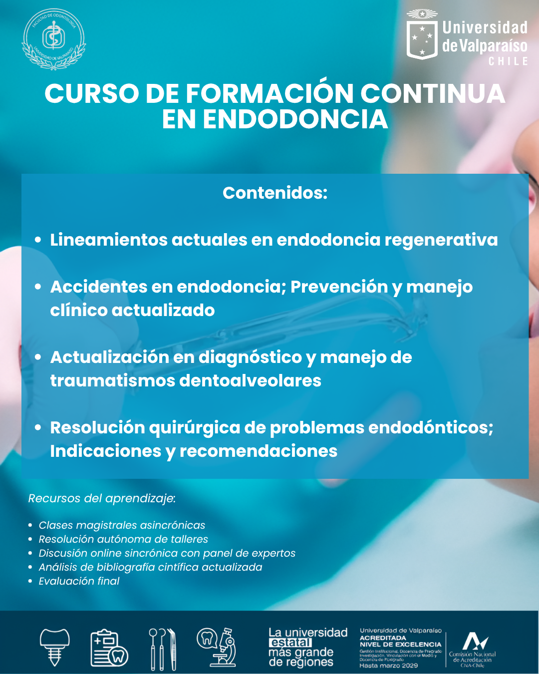 Sí. Al cumplir los requisitos académicos y de participación, los asistentes recibirán certificación oficial de Curso de Formación Continua en Endodoncia, emitida por la Universidad de Valparaíso.